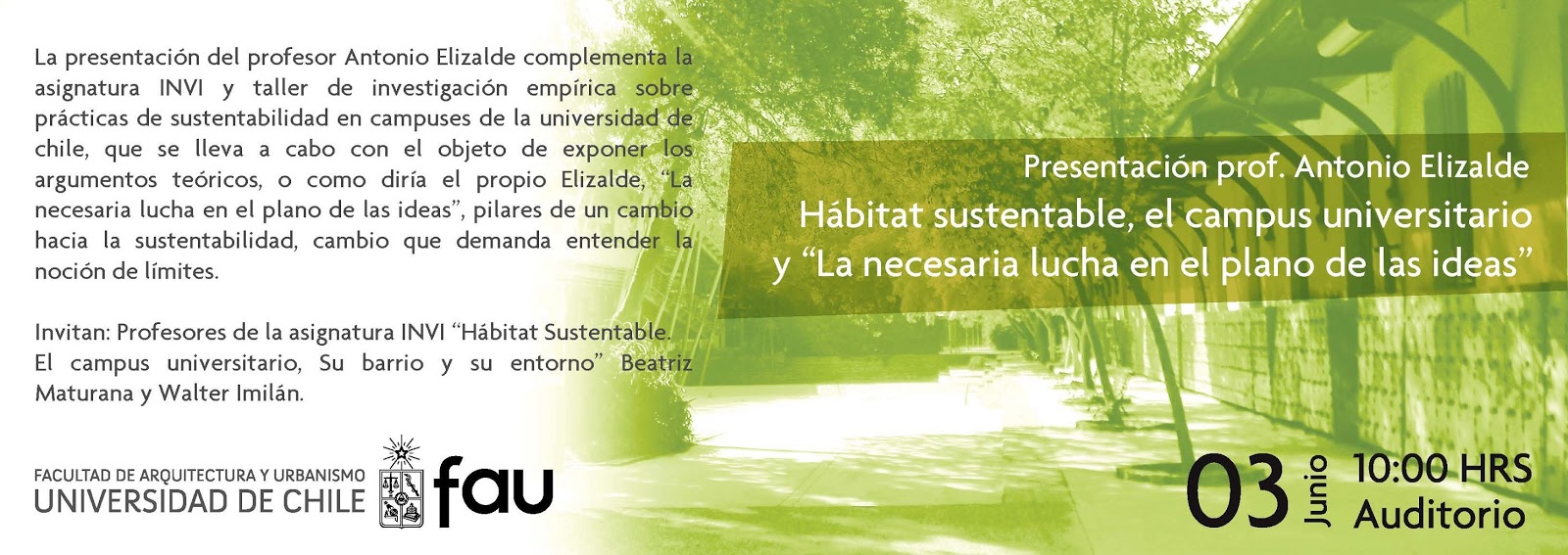 Invitacion1El próximo lunes 3 de junio a las 10.30 el profesor Antonio Elizalde dictará la charla «Hábitat sustentable, el campus universitario y “la necesaria lucha en el plano de las ideas” en el marco del curso INVI “Hábitat sustentable: el campus universitario, su barrio y su entorno”, que imparten Beatriz Maturana y Walter Imilan.