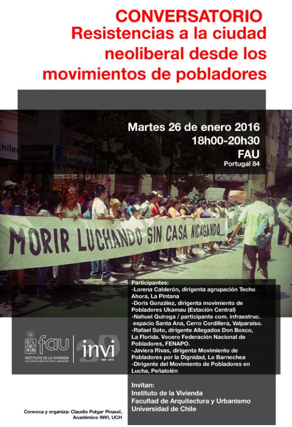 Conversatorio que se realizará el próximo martes 26 en la FAU, a las 18.00 hrs. Durante los últimos 15 años diversos movimientos de pobladores en todo el país se han (re)organizado dándole continuidad al histórico movimiento de pobladores chileno del siglo XX. Muchos nacen como comités de allegados, de vivienda o de deudores, desarrollando importantes…
