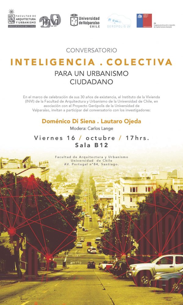 El viernes 16 de octubre, a las 17.00 hrs. se realizará el conversatorio “Inteligencia colectiva para un urbanismo ciudadano» con los investigadores Doménico Di Siena y Lautaro Ojeda, con la participación como moderador del académico INVI Carlos Lange. Esta actividad es parte de la celebración de los 30 años de existencia del INVI y es organizada junto al Proyecto Gerópolis…